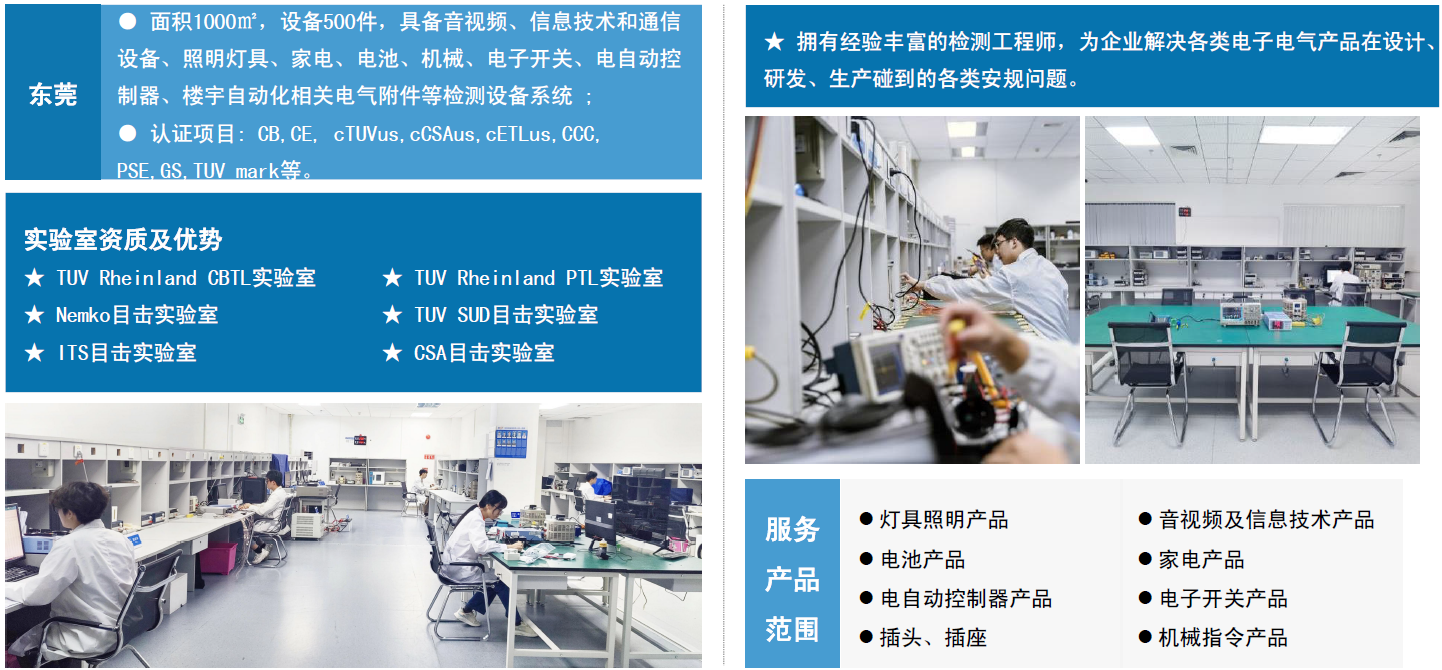 东电检测安规(Safety)实验室拥有示波器,功率计,测试指,直流电源,交流电源,可程式恒温恒湿箱,UL淋雨装置,IP测试装置,盐雾试验机,针焰测试仪,灼热丝测试仪,滚筒跌落试验机等300多台/套安规仪器设备。
